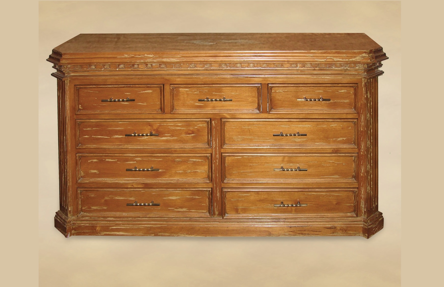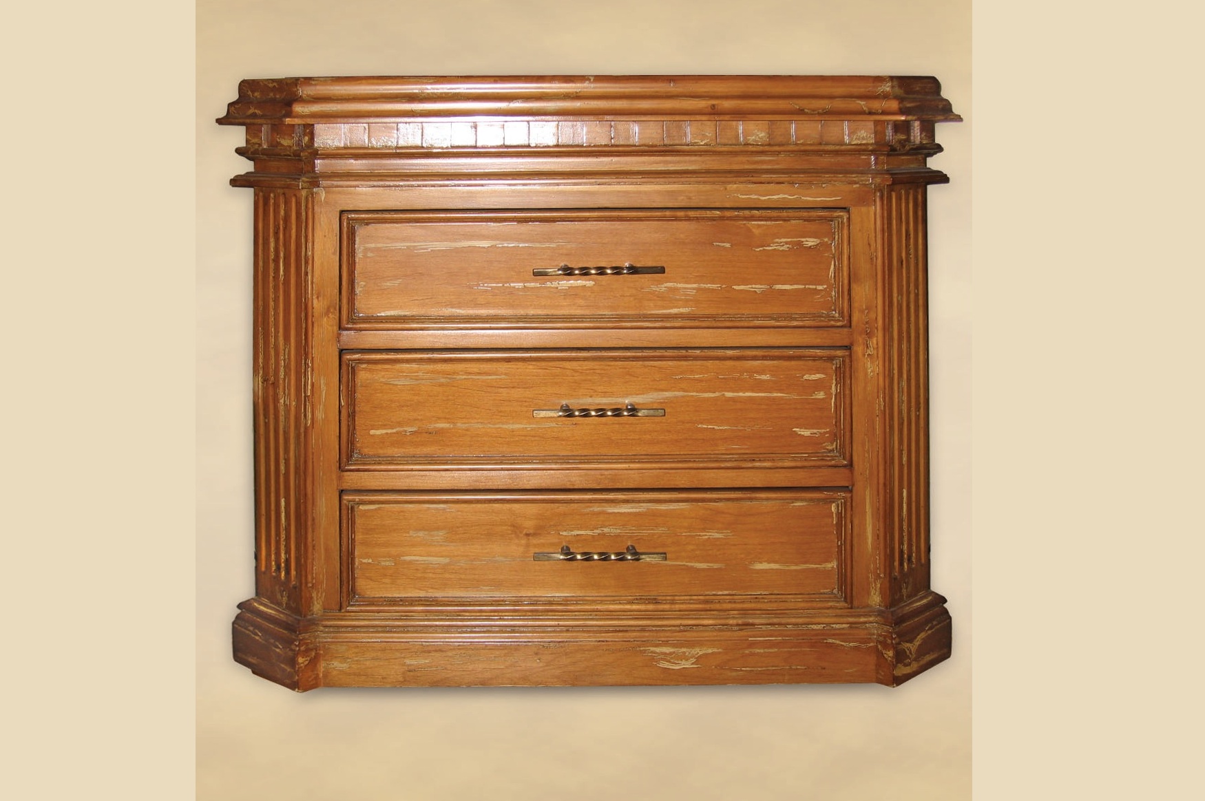 Comes with three drawers. Available with wood or stone top. Stone tops include: Marble, Travertine or Fossil
