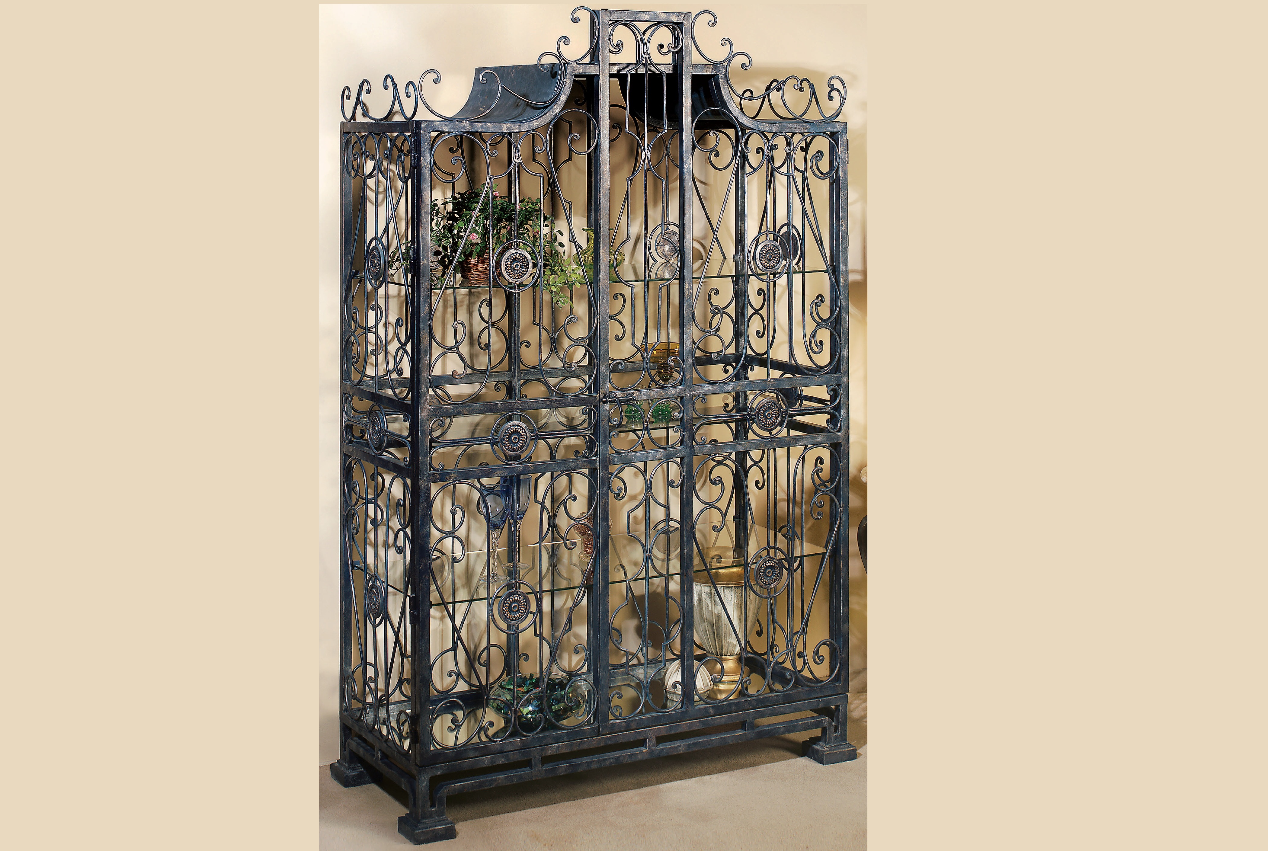 Orleans Curio Cabinet A-OR01 All hand-forged iron and hand-finished. Includes four 3/8 thick glass shelves. Available in four metal finishes. Dimensions: 48"w x 20"d x 711/2"h