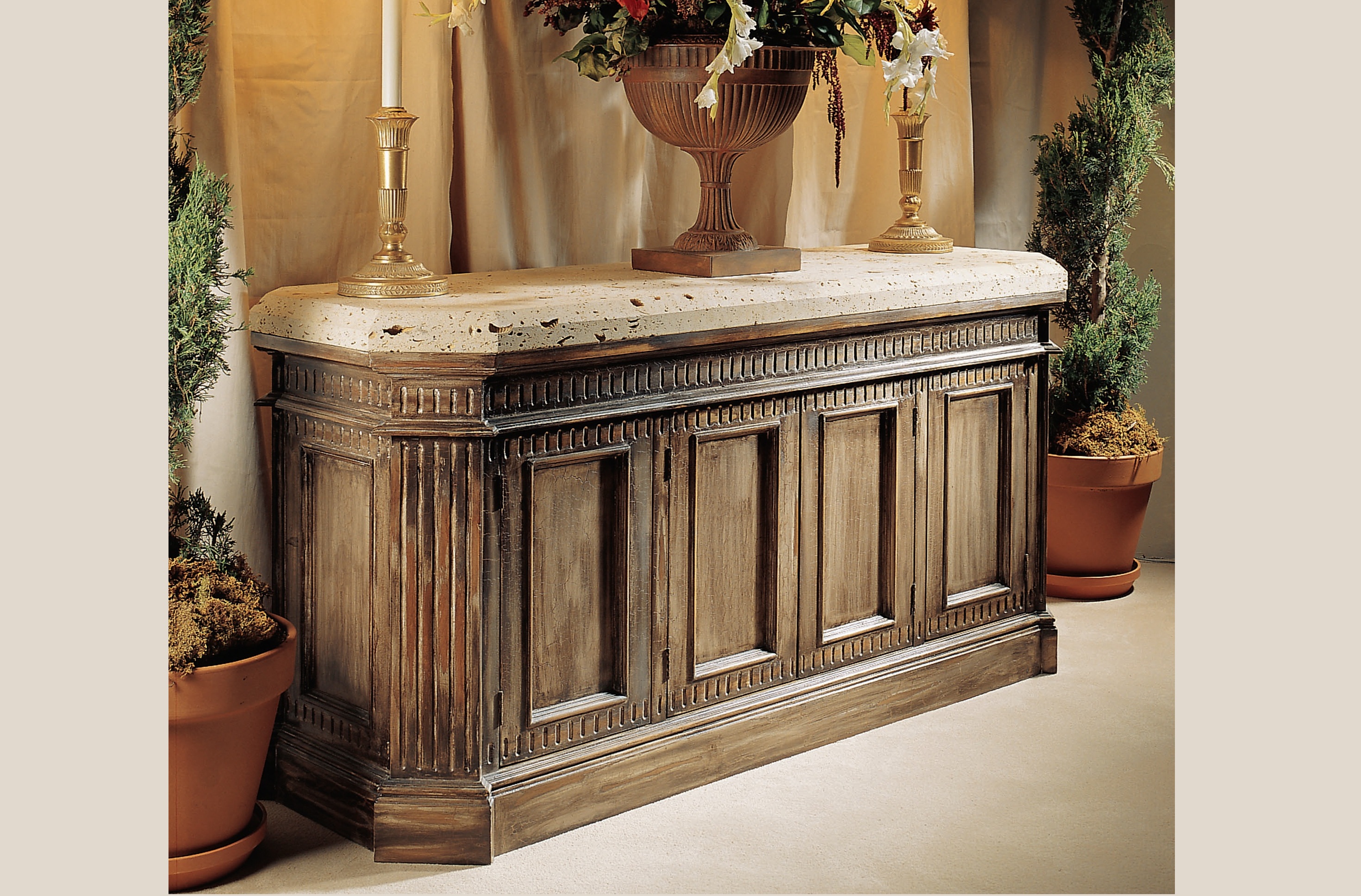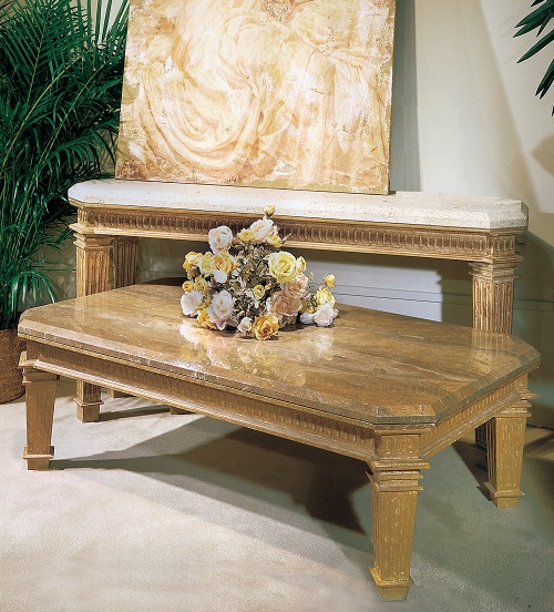 All hand-carved in solid wood and hand-finished. Available with Wood or Stone top.