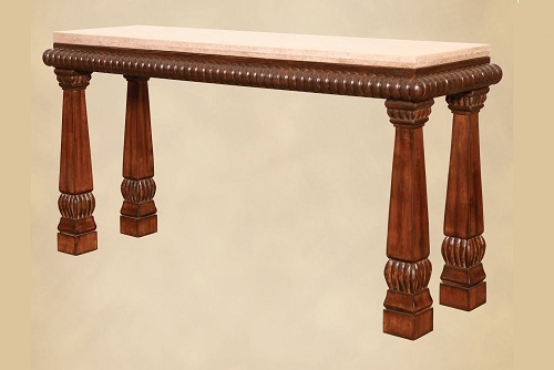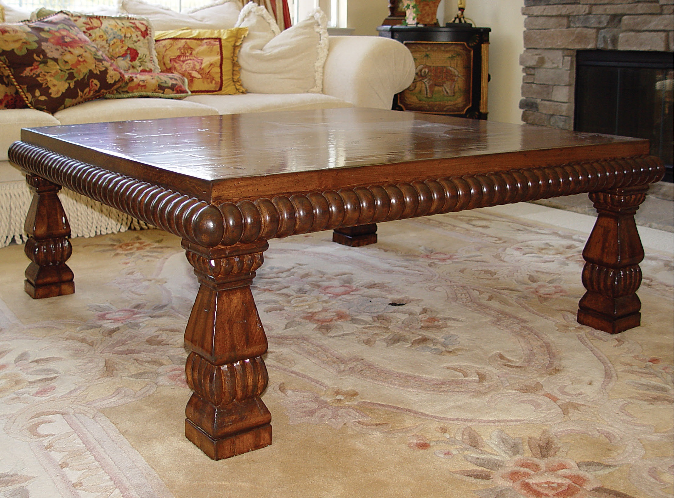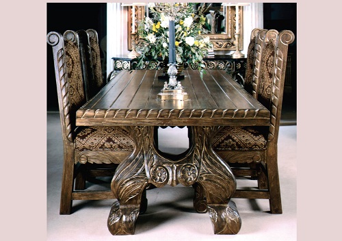 Dramatic plank-st yle table is all hand-carved in solid wood.