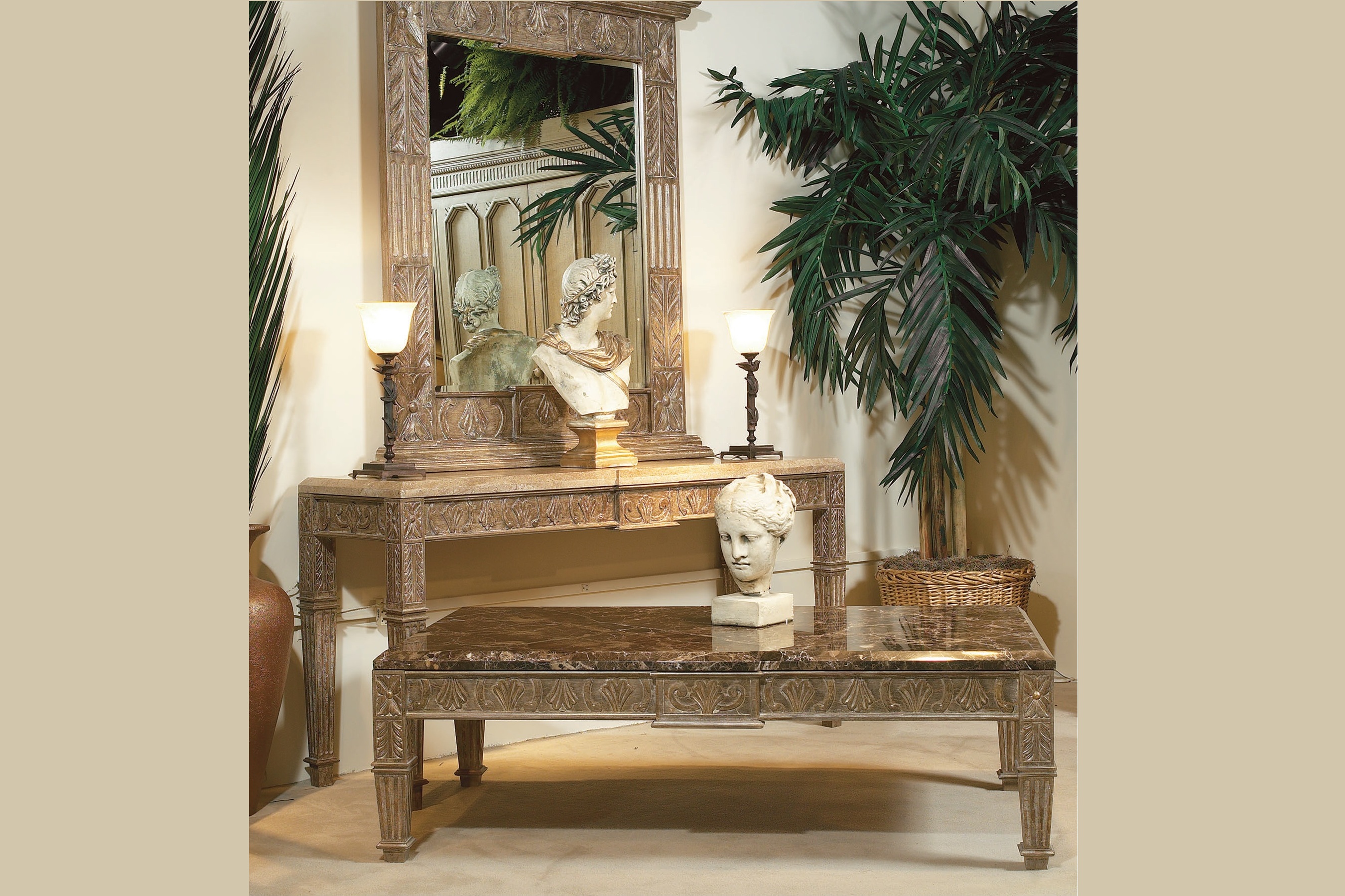 Hand-carved and hand-finished in solid wood. Available with Wood