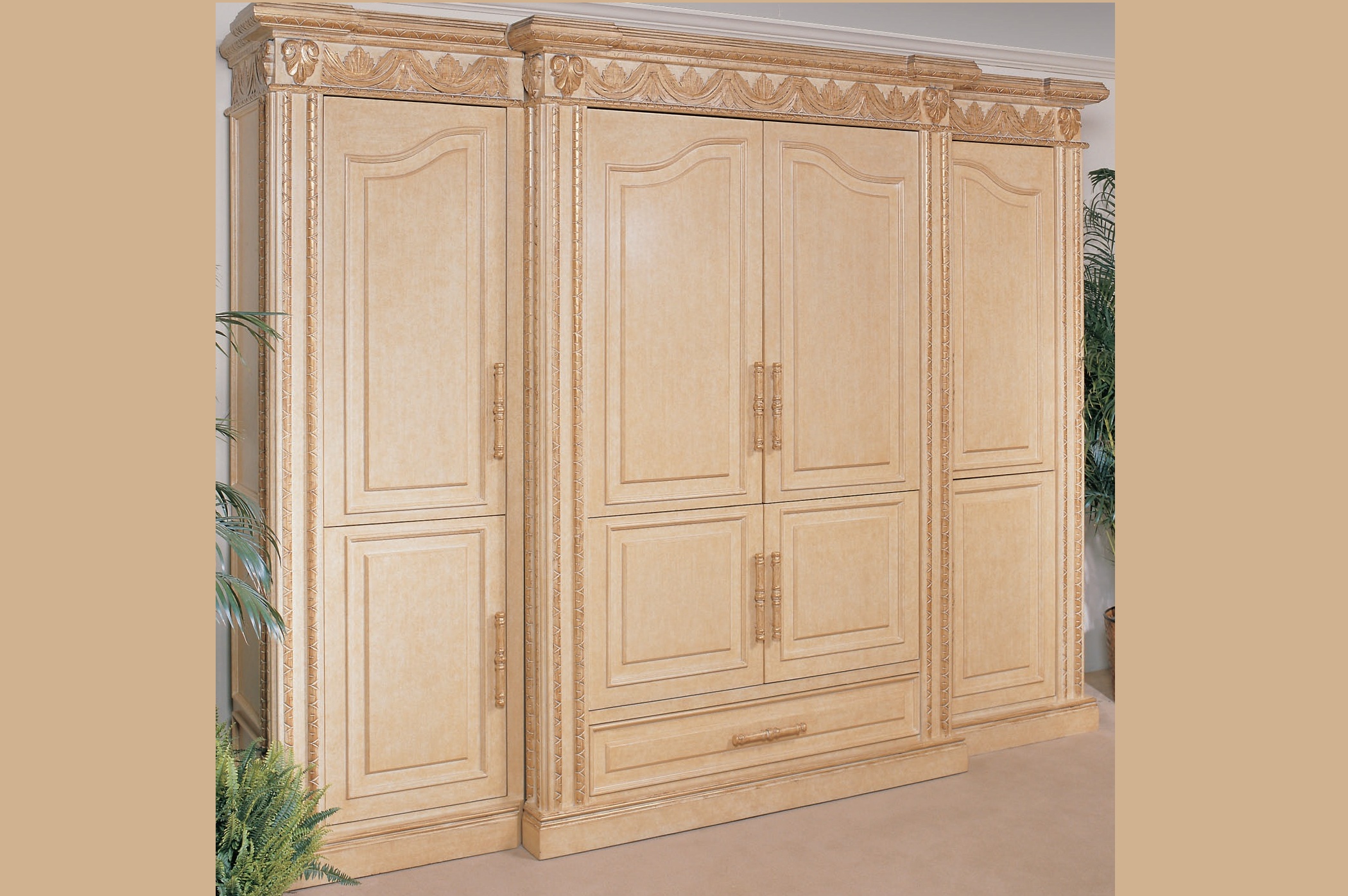 Lower section has standard doors with three drawers or two adjustable